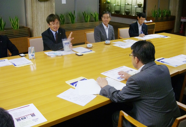 大村知事(手前)に報告する小沢社長と稲葉市長ら(左から、知事公館で)