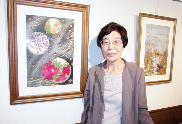 「押し花絵画の深みを味わって」と話す山西淑美さん