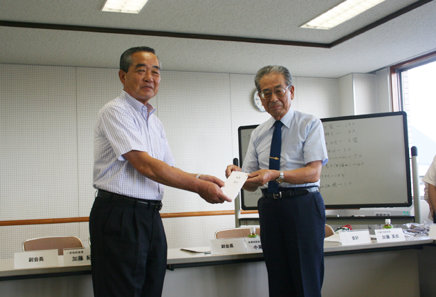 伊藤憲男会長㊧に目録を手渡す伊藤亮三会長