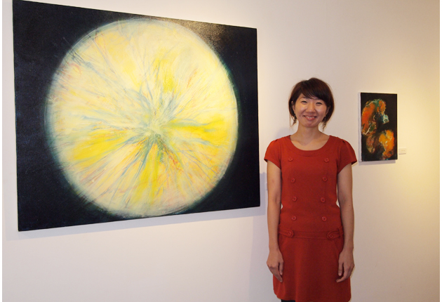 油彩「光へ」㊧と、作者の小杉真弓さん