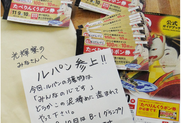 豊川市光輝町の児童養護施設・光輝寮(神谷常憲寮長)に7日、豊川の「ルパン三世」を名乗る人物から、B―1グランプリin豊川のチケット3万円分が届けられた。添えられた手紙には、同名アニメ映画『カリオストロの城』になぞらえ「ルパンの獲物はみんな...