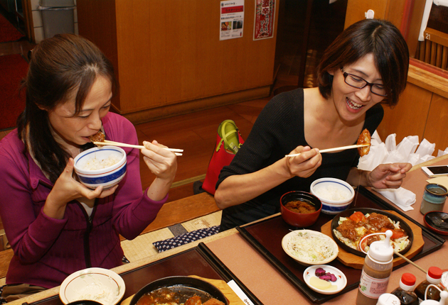 食事会でおいしそうに認定メニューを食べる参加者たち(かつ時豊橋店で)