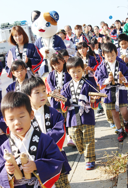 9日から始まる全国秋の火災予防運動を前に5日、田原市の赤石幼稚園(岡田実会子園長)の園児らが、はっぴ姿で市内をパレードして地域住民に火災予防を呼びかけた。 パレードを行ったのは、同園の年長園児22人。はっぴを身につけた園児たちは拍子木を打...
