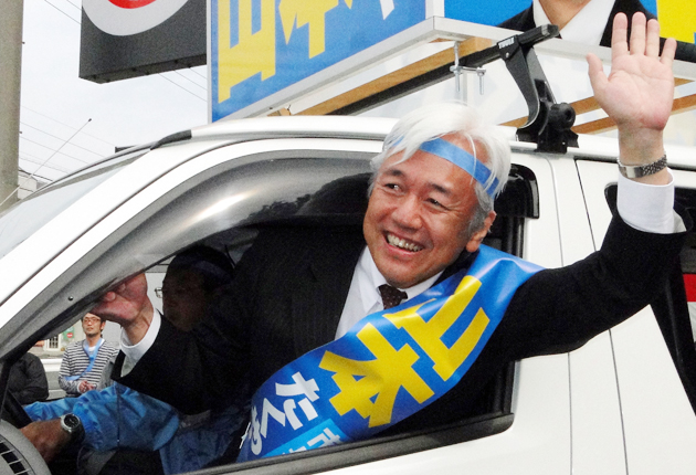 車から手を振る山本氏