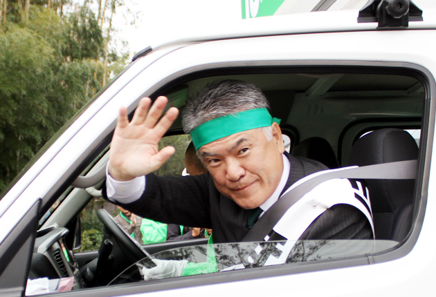 車から手を振る穂積氏