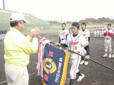 東海チャレンジャー選手に優勝旗を授与する片桐会長