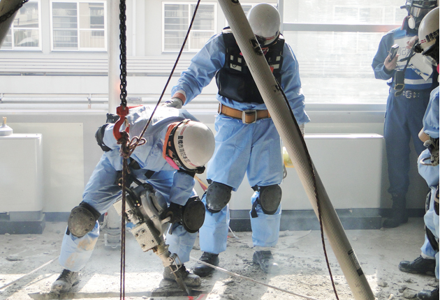 コンクリート床に穴を空ける隊員