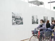 明治時代の豊橋駅舎などの写真パネルが展示された工事フェンス