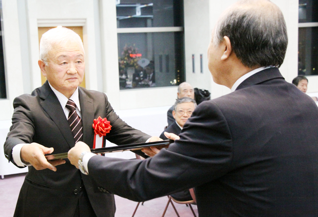 吉川会頭から賀状を受ける岡村正治氏㊧