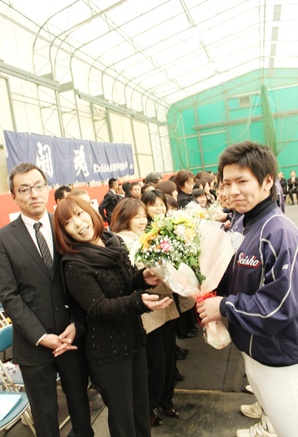 保護者に花束を贈呈する部員