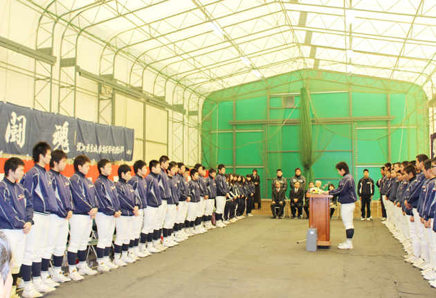 関係者にお礼の言葉を述べる小塚啓太主将と部員