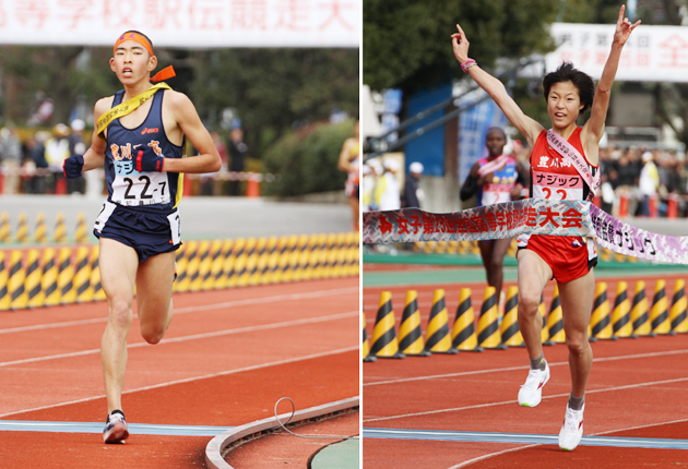 大会史上最多の4度目となる優勝のフィニッシュテープを切った豊川女子最終走者の鷲見梓沙㊨とレースを終えた豊川工男子最終走者の田中智也
