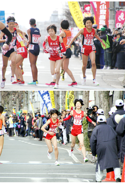 1区・関根花観は3位で2区・堀優花にたすきを渡した㊤、第4中継所では榊原海紗が鷲見梓沙へトップでたすきをつないだ