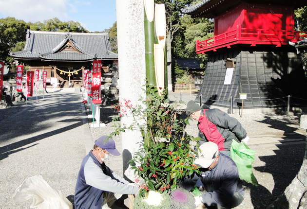 牟呂八幡宮(豊橋市牟呂町)で22日、門松の飾り付けが行われた。同宮では新年を迎える準備を進めており、31日から師走の大はらい、元日の午前0時から初祈とうなどを開き、初詣客を迎え入れる。 門松は、氏子総代や社守15人が集まって制作。牟呂用水...