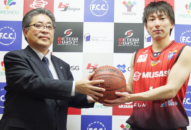 愛知赤十字センター豊橋出張所の日比野課長にサイン入りボールを贈る、浜松・東三河フェニックスのキャプテン大石慎之介選手㊨