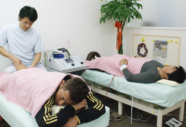 尾﨑院長から治療を受ける、金子選手(手前)と深谷選手