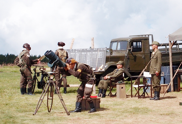 映画「永遠の0」のロケ風景。豊川市教委が美術協力した三脚付き双眼鏡