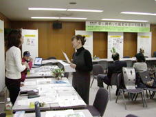 立ったままで創業した若い女性社長に次々に質問する来場者も