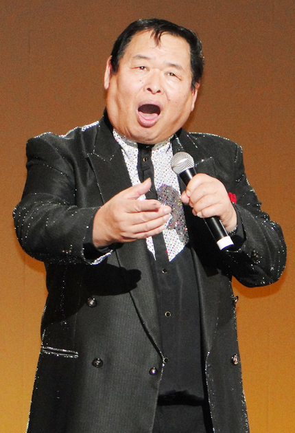足立会主の曲を熱唱する名誉顧問・司さん(豊川市文化会館で)