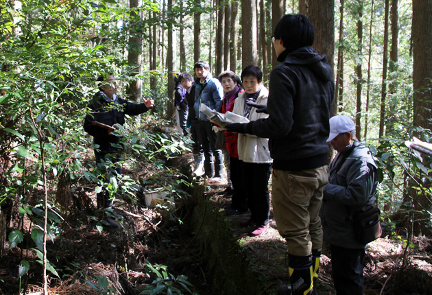 写真やメモを取りながら熱心に導水路・貯水槽跡を見学する参加者ら