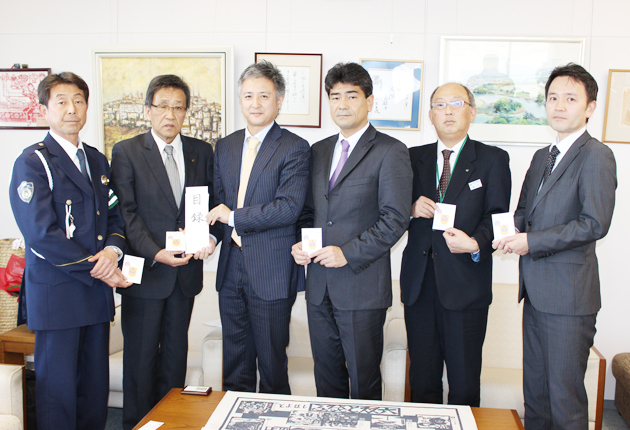 加藤教育長(左から2人目)にワッペンを贈った4社の代表ら