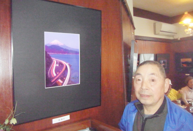作品「薩埵(さった)峠」と八木さん(アート・サロン喫茶イブで)