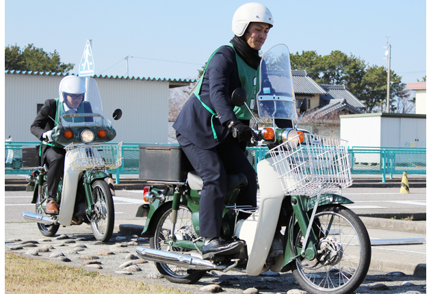 同金庫の男性職員は、2年目からシフト付きのミニバイク(50㏄)に乗って顧客先へ出向き集金活動をするなどの業務を担うようになる。その前に運転方法に慣れるよう、5年ほど前から毎年同校で安全運転講習会を開いて、職員の交通事故防止に努めている。