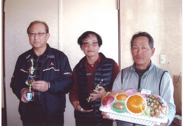 優勝の松本岩生さん㊥、準優勝の森下一広さん㊨、Bクラス優勝の木村雅二さん㊧