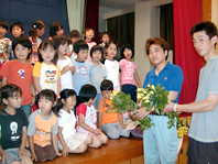 山口さん㊧、川合さんのバラが届き大喜びの園児(二川東保育園で)