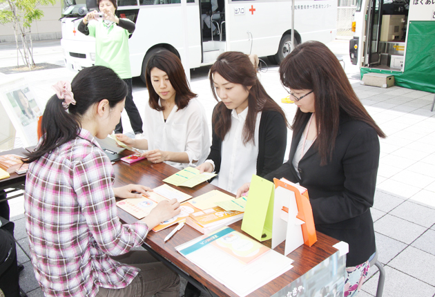 ドナー登録について説明を受ける会社員ら(豊橋駅南口駅前広場で)