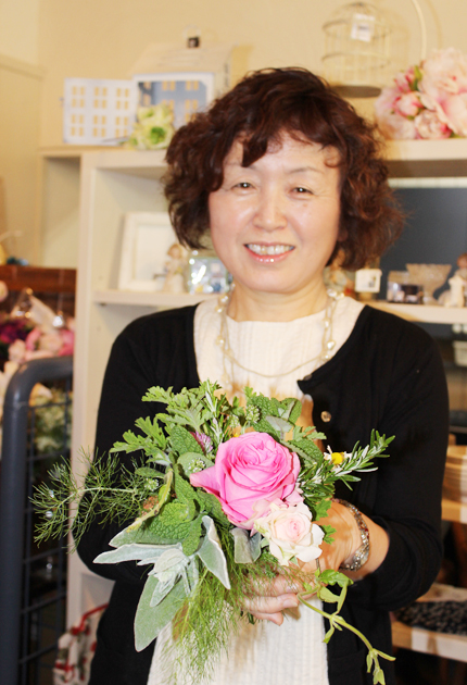 ハーブとミニバラのブーケを手にする金田主宰(田原市田原町で)