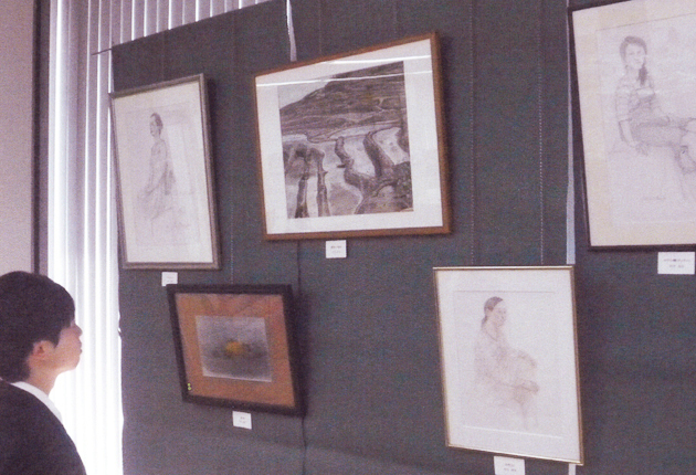 豊橋デッサン会会員の作品が並ぶロビー