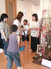 玄関に展示した見事なアレンジフラワーを説明する住吉代表(右)