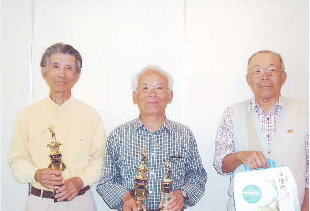 記念写真に納まるAクラス優勝の伊与田さん㊥と準優勝の村田さん㊨、Bクラス優勝の山田さん(提供)