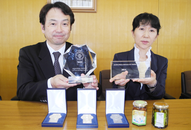 トロフィーを持つ平松賢介社長㊧と平松泉専務