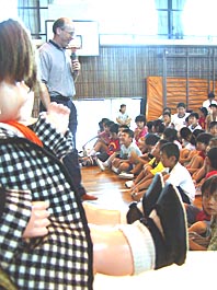 「コネタ」が見守る中、ゴードンさんの楽しい話が聞かれた(西郷小学校で)