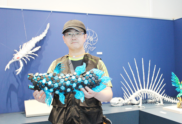 色付きアルミホイルで作ったシーラカンスと作者の本田さん
