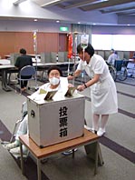 豊橋市民病院で8日、参院選の期日前投票が行われた。入院患者840人のうち、20歳以上の有権者は726人。うち183人から申し出があり、行った。 院内講堂に臨時投票所を設け、大須賀和子看護局長と天野裕司事務局長が立会人となって実施。元気な患...