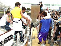 バリアフリー桟橋「マンボウ」からヨットに乗り込む障害者