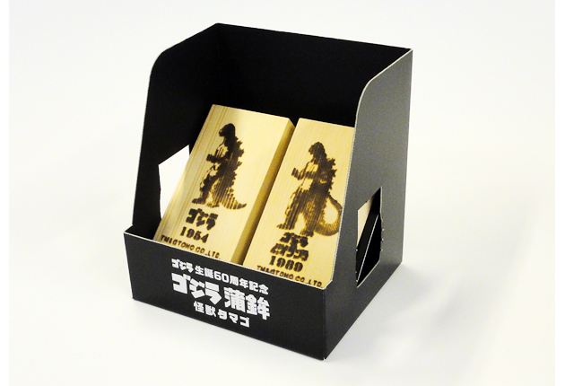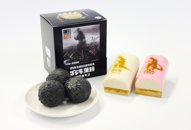 今年生誕60周年を迎えた怪獣ゴジラを焼き付けた「ゴジラ蒲鉾」が、ヤマサちくわ(豊橋市下地町、佐藤元英社長)から発売された。受注生産で発売された「ゴジラ蒲鉾セット」は、1954年版ゴジラと1989年版ゴジラのイラストをそれぞれ焼きつけた白と紅の蒲鉾2枚と、黒く着色したすり身で玉子を包んで揚げた「怪獣タマゴ」3個が入って5800円(税別)。