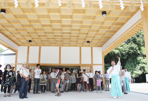 三宅さんの説明を聞く参加者たち(砥鹿神社で)