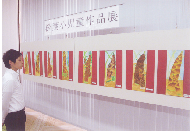 松葉小学校3年生の児童の作品が並ぶ絵画展