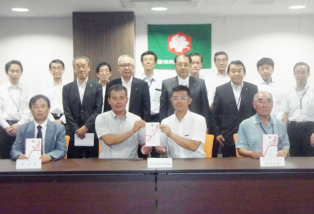 贈呈された目録を手にする3団体と豊橋商工信組役員ら