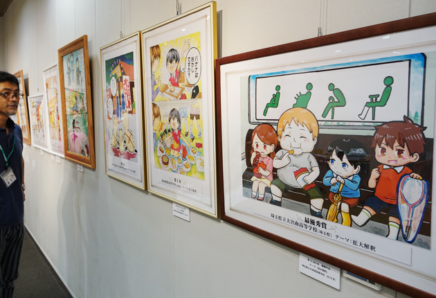 まんが甲子園の歴代優秀作品などが並ぶ会場と野中さん