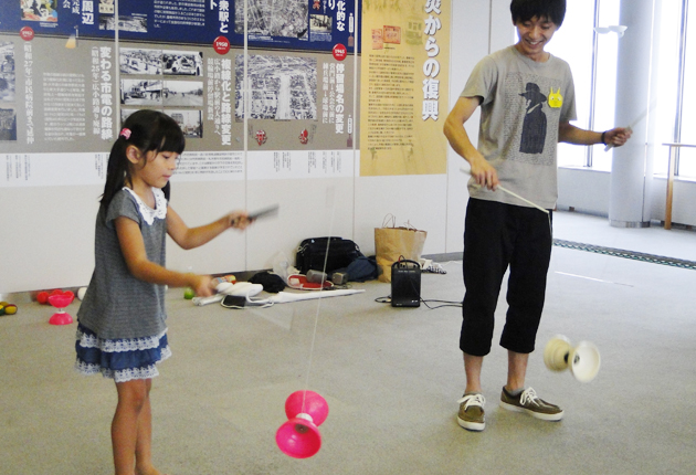 豊橋市役所13階の「とよはし物語館」で23日、夏休みイベント「ちびっこワクワク体験広場」が開かれた。大学生による大道芸パフォーマンスや「ミニほっトラム」の乗車体験などを子どもたちが楽しんだ。24日まで。 会場では、愛知大学名古屋校舎のエン...