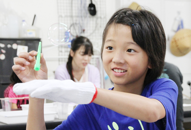 軍手で触っても割れにくいシャボン玉を試す子ども