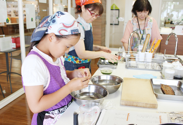 参加者は、市職員から地産地消の利点や豊橋の農業の現状などについて話を聞いた後、早速調理に。教室には冷や汁の麦みそやうなぎの蒲焼きの香ばしい香りが漂う中、親子が協力して料理に取り組んでいた。