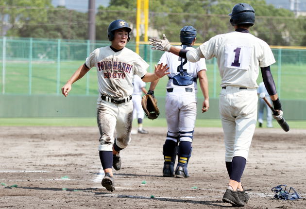 仲鉢貴大㊧が森奎真とハイタッチしながらダメ押し3点目のホームイン