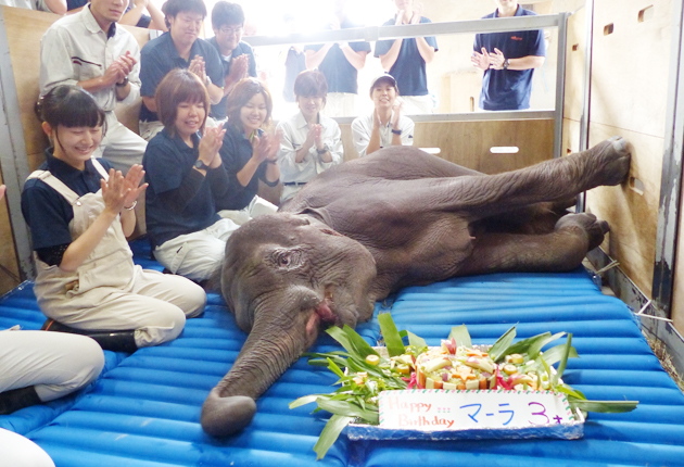 マーラを囲み、職員が特製ケーキで誕生日をお祝い