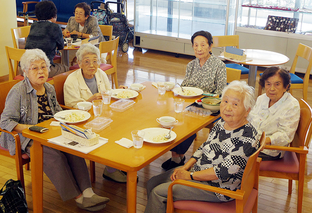 おしゃべりしながらランチを楽しむ(右から)夏目さんと曽我さん、加藤さん、須田さん、古田さんの5人